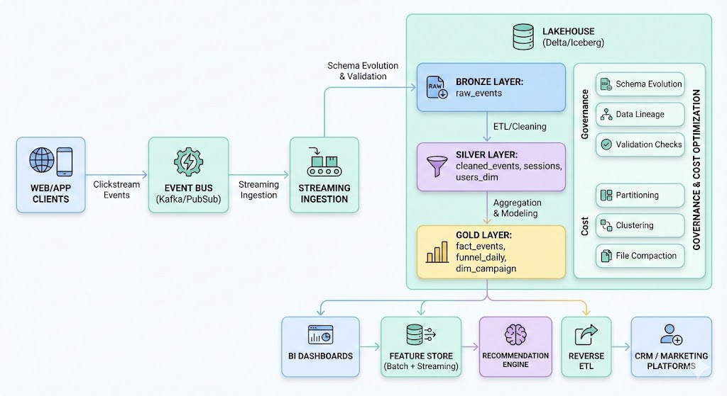 A complete end-to-end architecture for building scalable clickstream analytics and real-time user understanding using a Lakehouse, streaming ingestion, and ML-ready data models.